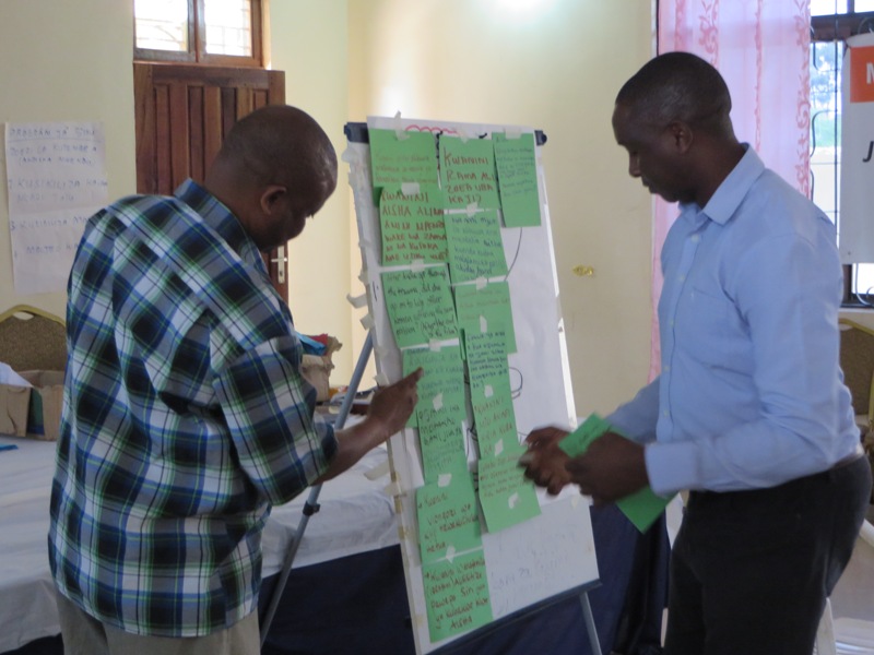 Wawezeshaji wa UZIKWASA -Pangani Tanga Novatus Urassa ambaye pia ni Programu Meneja wa Jinsia na uongozi wenye Mabadiliko na Joseph Peniel ambaye pia ni Programu Meneja Mawasiliano na Kujenga Mahusiano kwa pamoja wakibandika karatasi zenye masuali kuhusu filamu ya AISHA, filamu hii ni kwa heshima ya wanawake wote waliowahi kubakwa na kwamba baada ya mkasa huo waliochukua hatua gani.